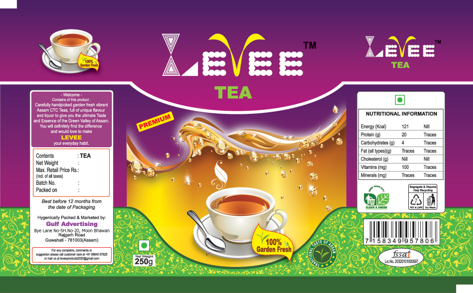"LEVEE TEA", Garden fresh Assam tea, full of unique flavour and liquor to give you the ultimate taste and essence of the green valley of Assam ,start your day with a vibrant sip of LEVEE TEA, you will definitely find the difference